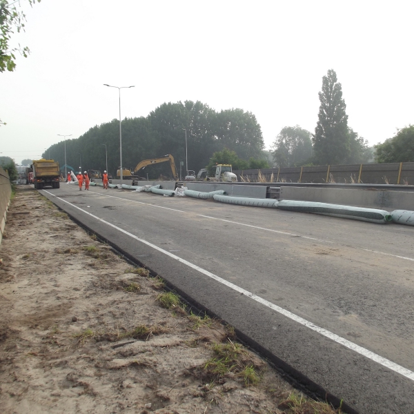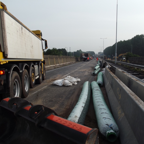 In het weekend van 8 juli 21.00 tot 12 juli 05.00 is de N3 bij Papendrecht voor de 3e maal afgesloten geweest.In dit weekend is er, naast vele andere werkzaamheden, op zaterdag 10 juli in 1 dag maar liefst 700 meter Drenotube inclusief putten aangebracht door Boskalis.