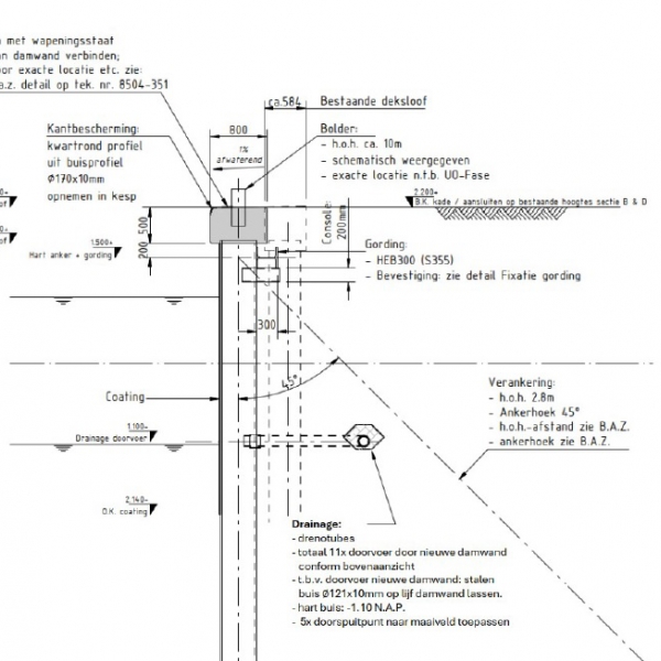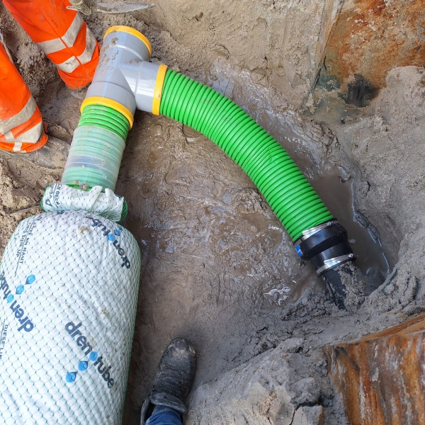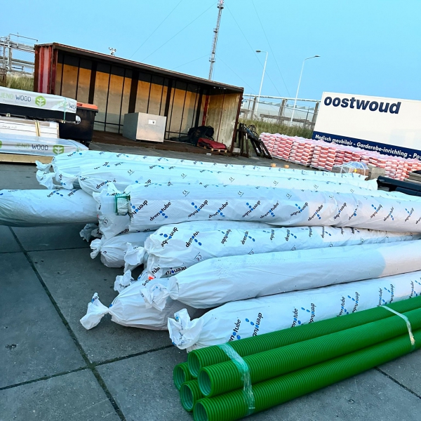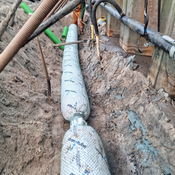 In de haven van Terschelling worden damwanden gerenoveerd als onderdeel van groot onderhoud van bijna alle veerhavens aan de Waddenzee. Voor drainage achter de damwanden heeft aannemer De Boer en de Groot gekozen voor Drenotube met door spuitputten van ca 3.5 m diep.